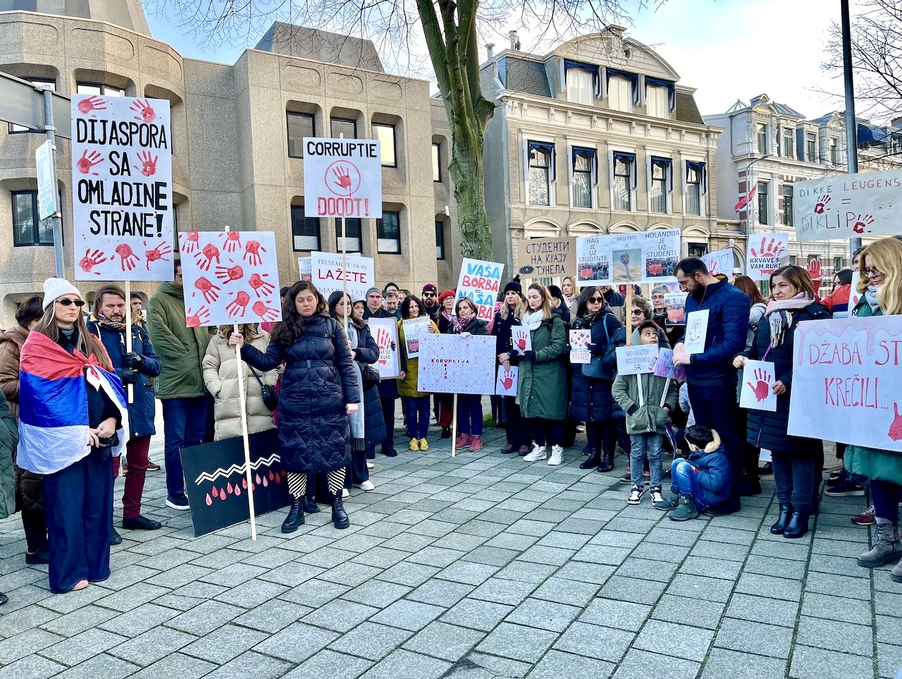 Skup je održan u 13 časova ispred Ambasade Republike Srbije u Hagu, a prisustvovalo je oko stotinu građana srpskog porekla koji žive i rade u Holandiji.
